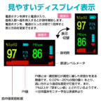 ●表示内容:酸素飽和度(SpO2)、脈拍数、脈波レベルメータ、その他各種エラーメッセージ